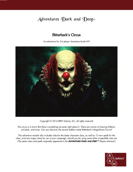 One of my fans has suggested that I set a stretch goal to come out with a print edition of one of my earlier adventures, Bitterbark’s Circus. The Circus is a mirthfully malevolent place, and can also be used as an expansion for Castle of the Mad Archmage (Level 11, Area 34, for those keeping track). Up until now, it’s only been available in pdf format.
