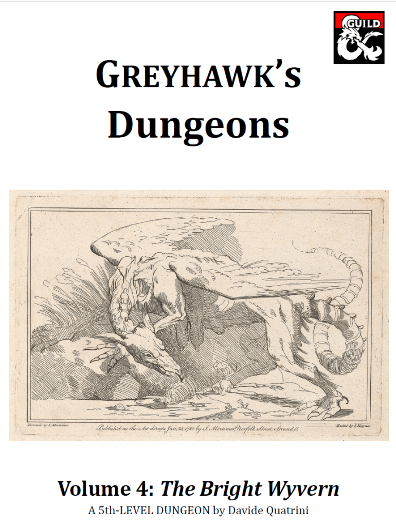 Today we take a look at Greyhawk’s Dungeons Volume 4: The Bright Wyvern by Davide Quatrini. This is a 4 page pdf, but that includes a public domain cover and a page of legal stuff, so it’s really 2 pages. This is essentially a one-page dungeon based on a map by Dyson Logos, like the others in the series, made for 5th level characters. Essentially a wyvern has made a lair, gathered some treasure and minions, and the PCs have to go there and do their thing. It’s straightforward, and probably good for a few hours. There’s nothing in the way of Greyhawk lore, and you could put this just about anywhere in the Flanaess and it would work. For 50 cents, it’s probably worth it to have in your back pocket in case you need to around out an evening.