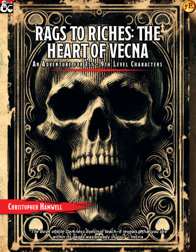 Today we have Rags to Riches: The Heart of Vecna, by a familiar author, Christopher Hamwell. This is a 278 page pdf with AI art and maps by Dyson Logos, but no bookmarks (boo!). It says it’s compatible with 5E, both the 2014 and 2024 rules.
